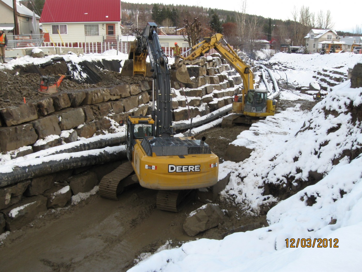 The project included; removal and disposal of 300 lineal metres of existing reinforced concrete flume and four bridges; design, construct and maintain temporary system to bypass creek flows around the site and construct rock stack walls, habitat features and concrete channel and wing walls, including shotcrete slop protection for excavations abutting existing structures.