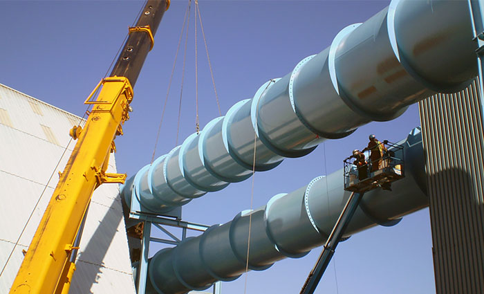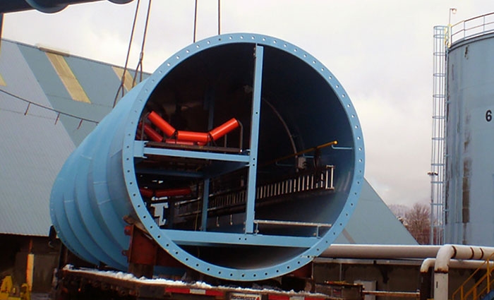 As part of a major infrastructure re-configuration project, Kinder Morgan contracted LNS to supply and install several fully-enclosed conveying systems for moving raw materials throughout their facility. The supply side of this project involved fabrication of 10 foot diameter steel tubes and all internal conveying hardware. The installation side of this project involved erecting all support structures and transfer towers, lifting each 30,000 pound tube section, installing all mechanical components and commissioning each system.