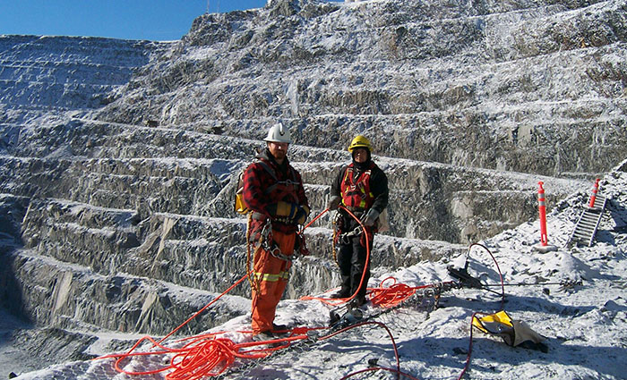 This challenging project involved recovering high-grade gold ore from the high wall of a completed, mined-out open pit in an area that was previously inaccessible to equipment. Our crew and equipment were airlifted by helicopter and crane to the work site, on an existing bench in the open pit. Daily access was accomplished by rappelling down the high wall. Our crew safely and efficiently completed rock slope stabilization, precision drilling and controlled blasting operations to facilitate the recovery of the high-grade ore.