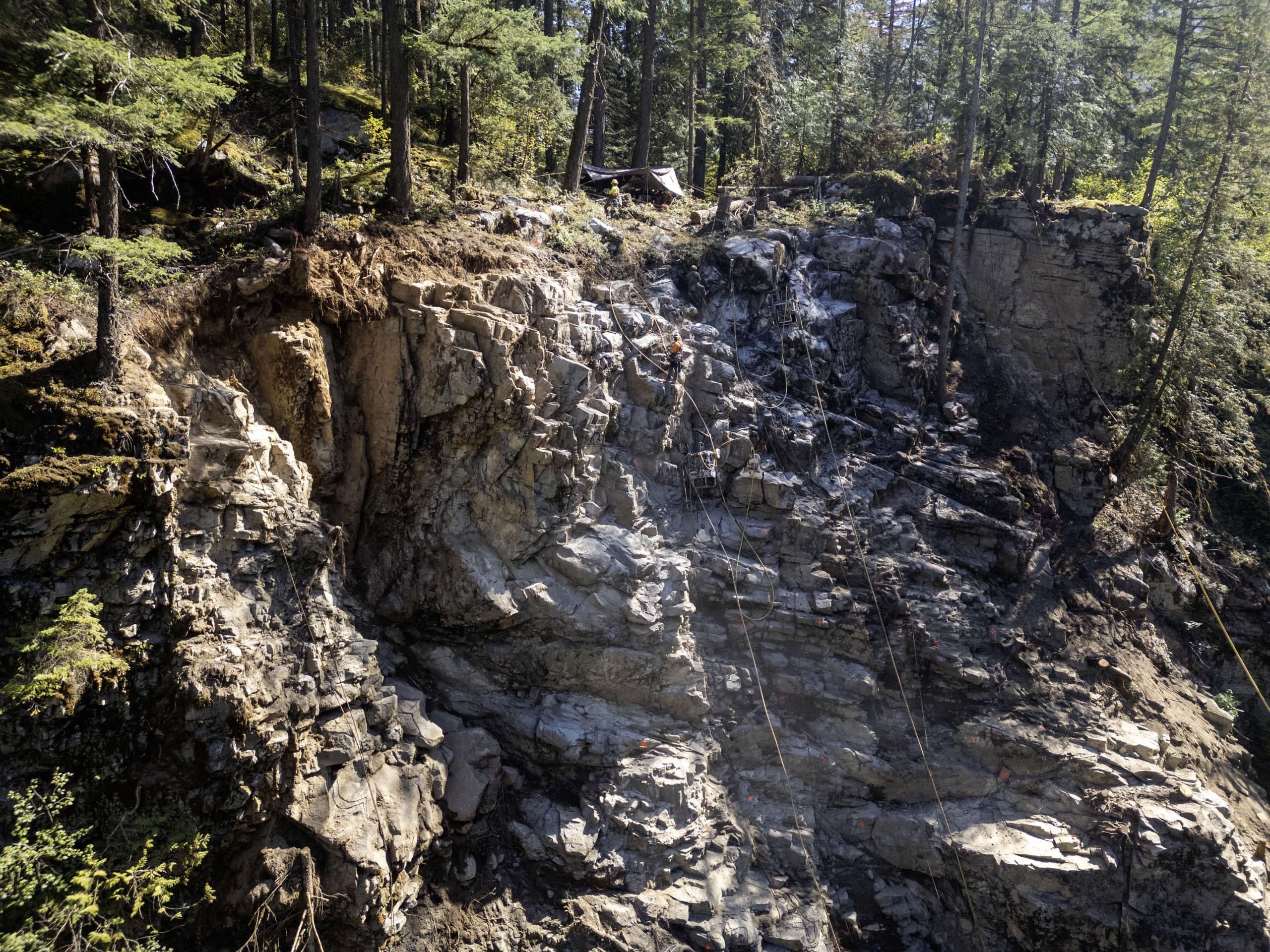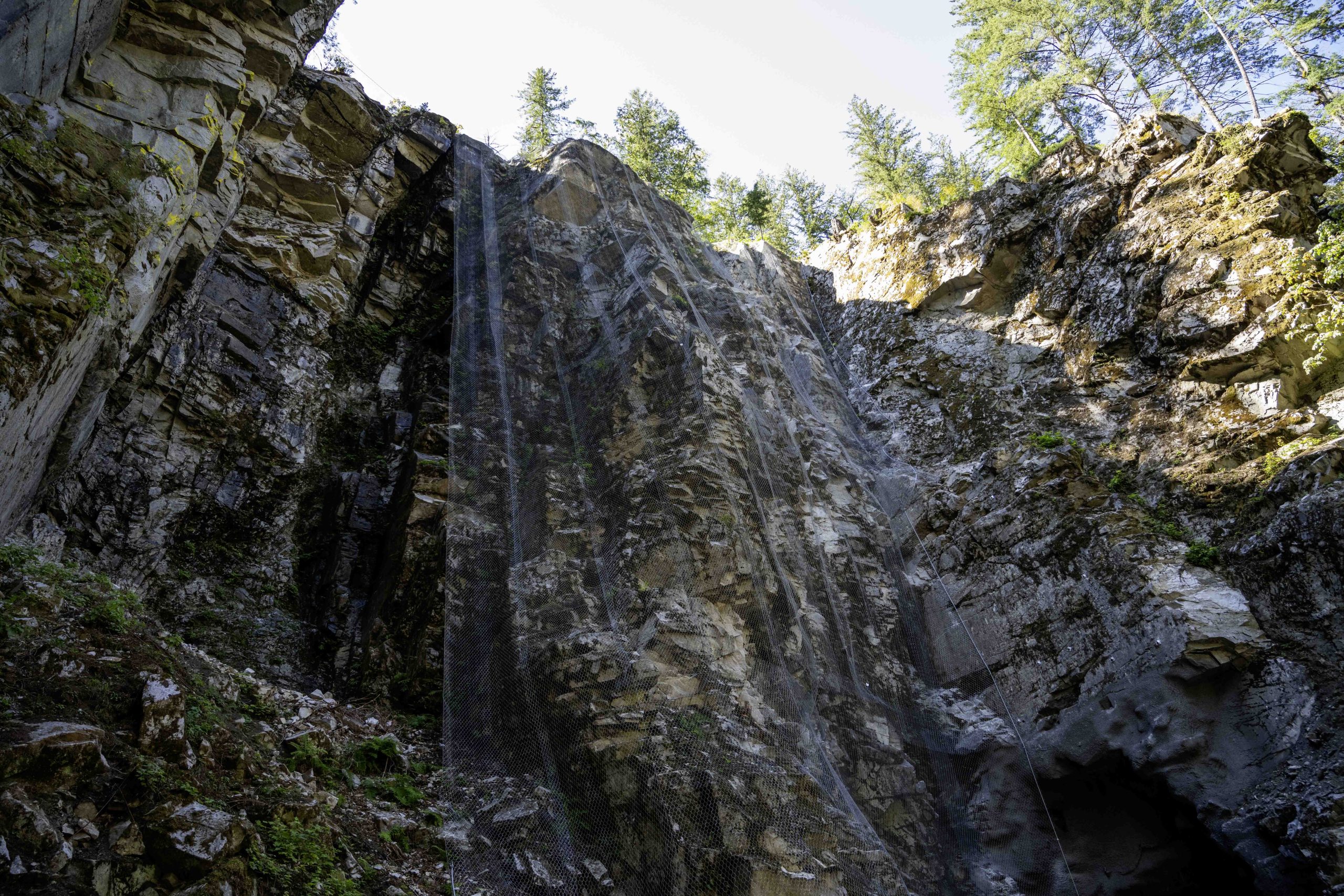 - Rock Scaling and Slope Protection: Crews drilled anchor patterns, installed ground supports, and used helicopters to fly in mesh reinforcement to minimize the risk of rockfall.