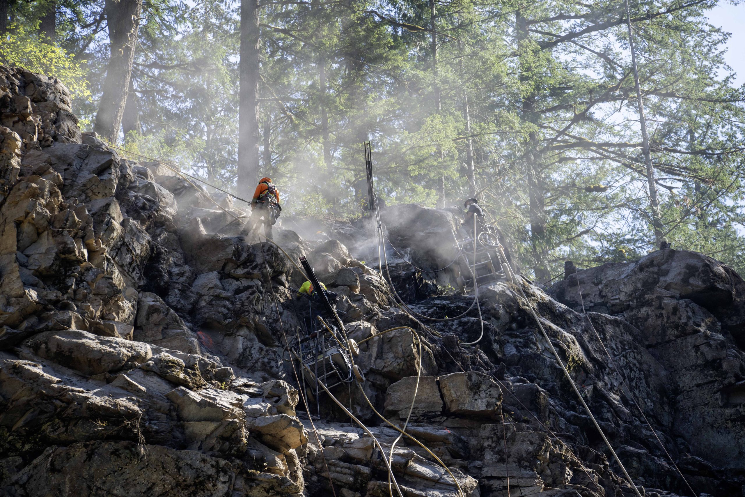 Pacific Blasting and Western Grater have partnered to stabilize the Coquihalla Canyon after extensive flood damage. The project involves securing rock faces, reinforcing tunnels, and preparing the site for bridge reconstruction, all while preserving the historic elements of the park.