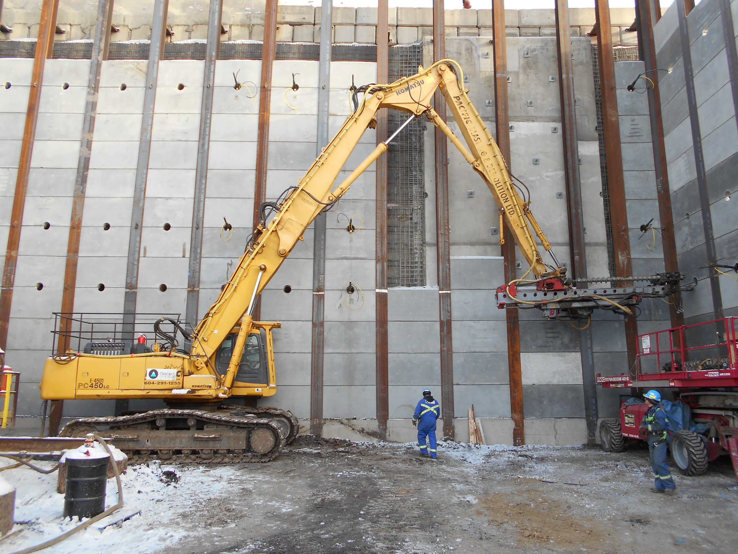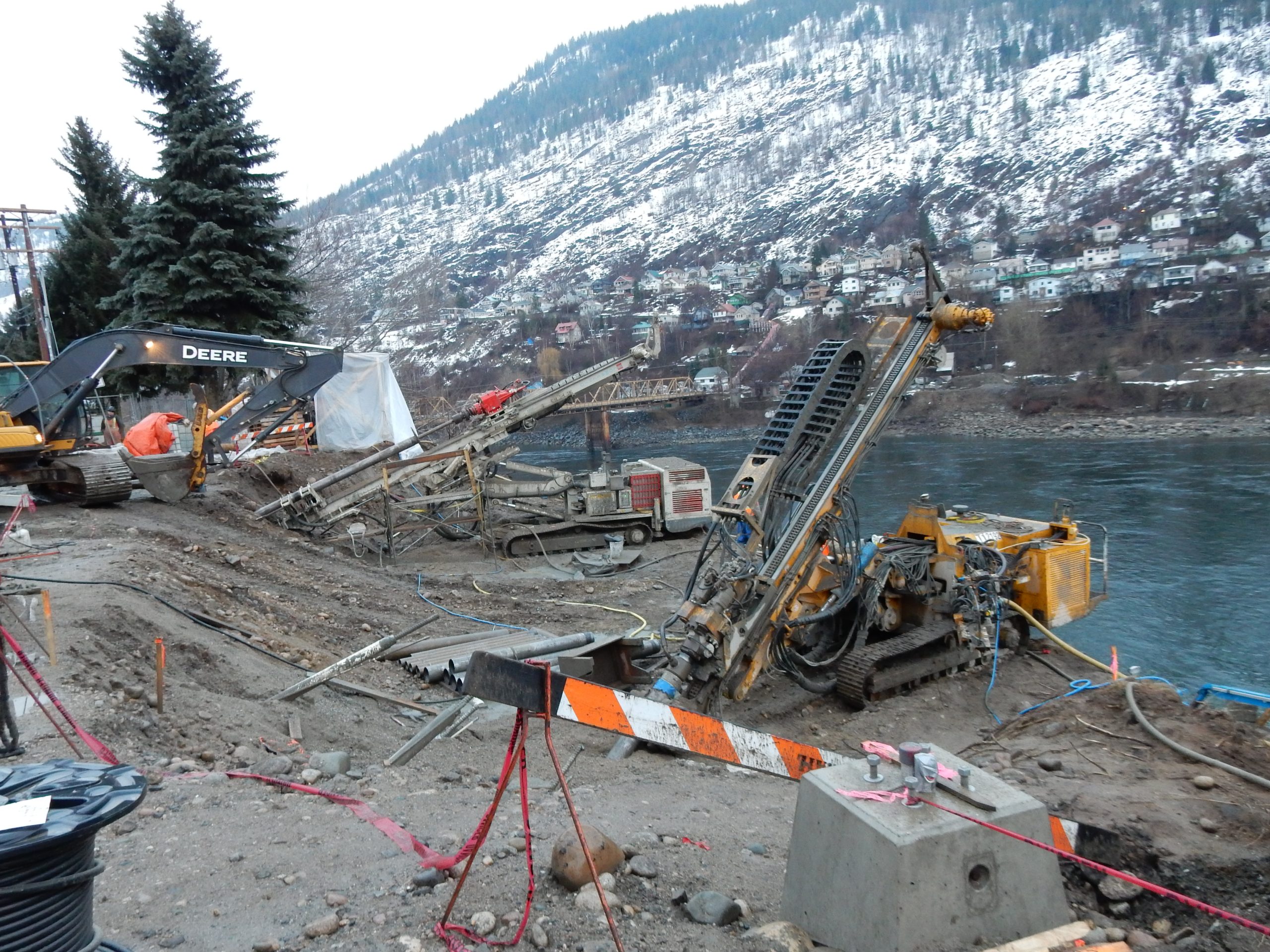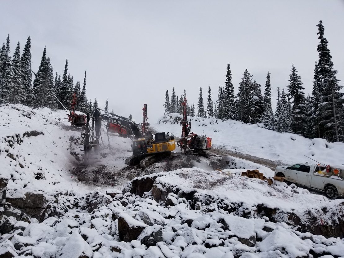 The main obstacle for this project was the coast mountains; going through a heavily glaciated valley with snow ten months of the year, and up and over challenging steep slopes, including a 1.6km long steep slope from a river valley to a mountain ridge. We were able to successfully complete these challenges and more, utilizing a fleet of up to 40 drills simultaneously on various portions of the four spreads. Our fleet of excavator mount drills gave us the flexibility to get in and create working areas for our production drills, and our smaller drills were able to be moved by helicopter allowing for us to work in more spots than if we had been limited to working only from access roads.