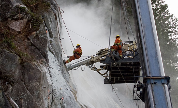 This project involved the drilling and installation of rock bolts measuring up to 66mm in diameter and 13.7m in length. In order to successfully complete this challenging project, we designed and fabricated specialized drilling equipment and used cranes to access the vertical slope.